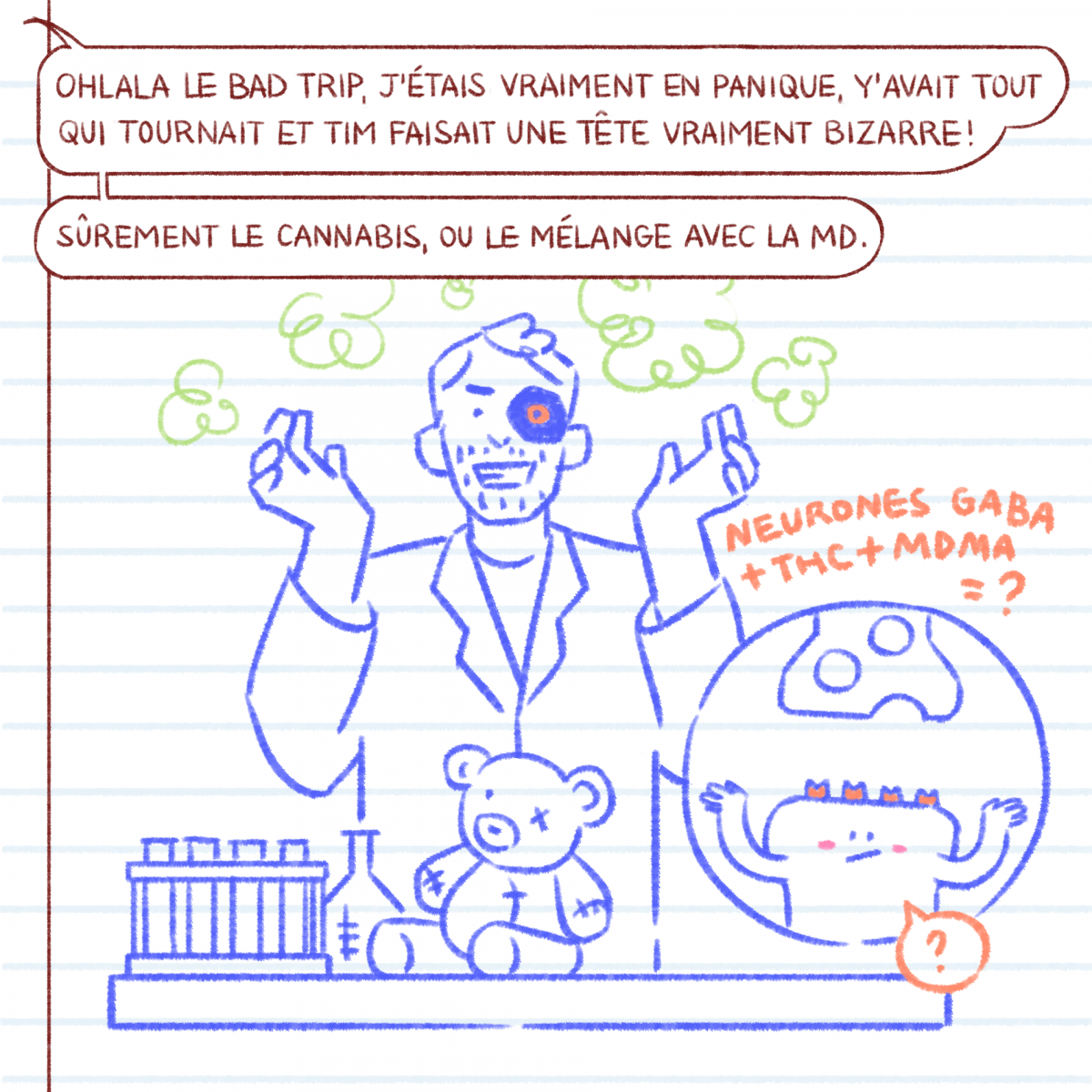 3e épisode de la BD Hier Soir saison 2, 3e jour de festival pour Clara et Tim où l'on continue de décrypter les effets de la MDMA et du cannabis...