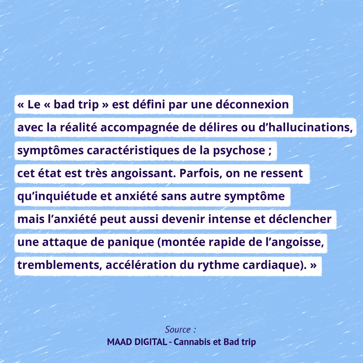 La manière dont l’organisme va réagir, positivement ou négativement au cannabis, est strictement individuelle et on ne dispose d’aucun facteur permettant de le prévoir. Des chercheurs ont montré qu’il vaut mieux éviter de fumer si on est triste, déprimé, anxieux, préoccupé, bref si on est mal. Un environnement stressant et un dosage fort en THC sont deux autres facteurs qui peuvent favoriser les crises d'angoisse. La suite dans l'article Cannabis et Bad Trip